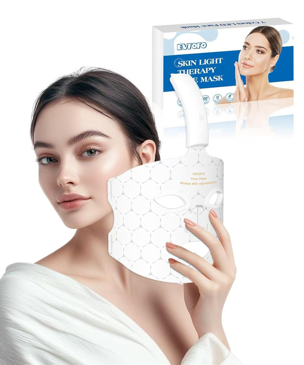 EVFOFO’s Wireless Photon Mask in white (9x7x1 in., 0.4 lbs) with 7 modes and NIR. Portable, ergonomic, timer. USB rechargeable (2 hr). 1-year warranty.